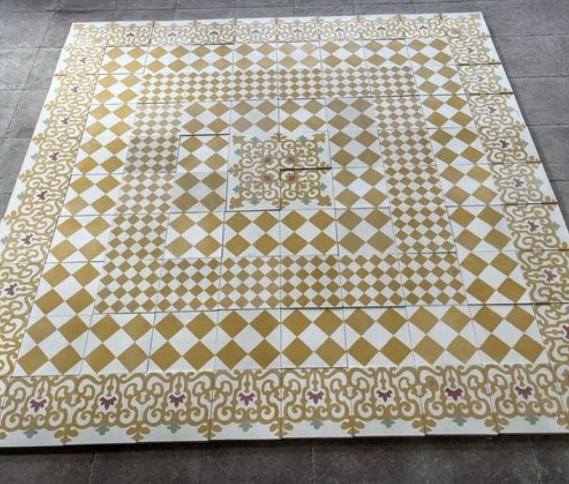 Alfombra compuesa por 4 M/2 en color mostaza con varias baldosas distintas formando el dibujo. 100 Piezas disponible para envío inmediato.